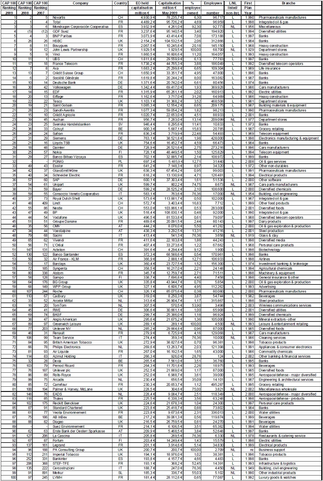 The European Employee Ownership CAP 100 in 2009